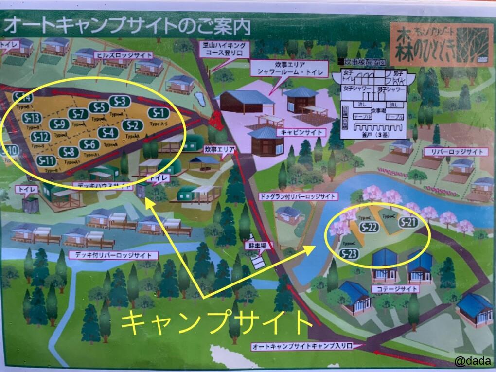 S-1からS-14となってるのがメインとなるオートサイト、離れた場所にS-21、22、23の3サイトがあり、キャンプサイトとしては大きくこの2つのエリアに分かれます。