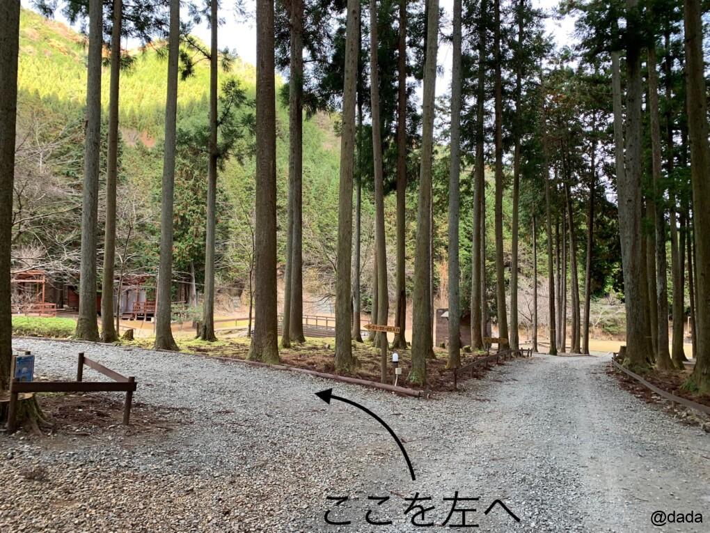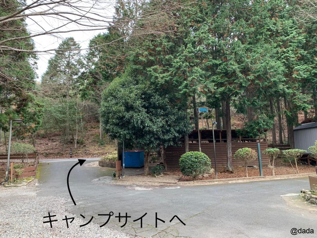 最初に注意したいのは、管理棟からサイトへ向かうとき、手前にも右に進んでいく道がありますが、これはコテージサイトへの道です!