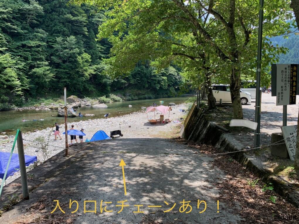 場内へ入る坂を下った後、左手にある川への進入口はチェーンが張られており、進入禁止となっているのでご注意を。