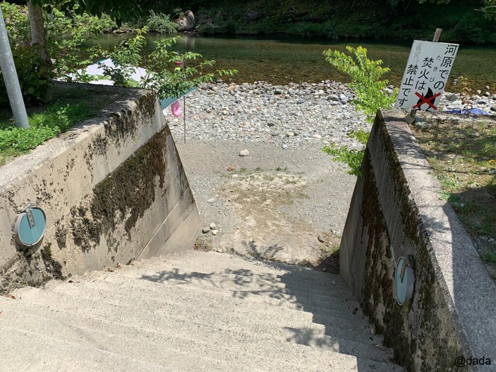 駐車場から川原への下り口ですが、坂の他にも2枚目の写真のような階段が2ヶ所あり、合計3ヶ所となります。