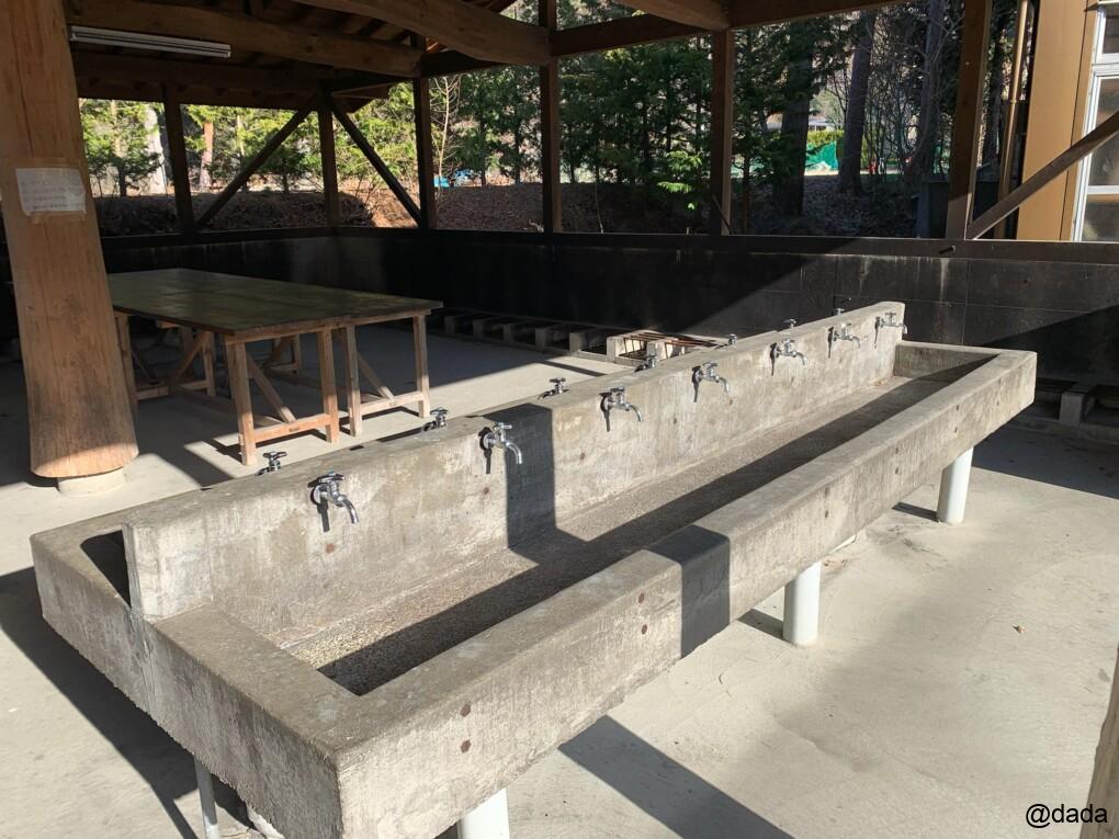 屋根もあり、しっかりした造りですが、キャンプサイトから一番離れた炊事場なので、主にバンガロー利用の方の炊事場になるかと。