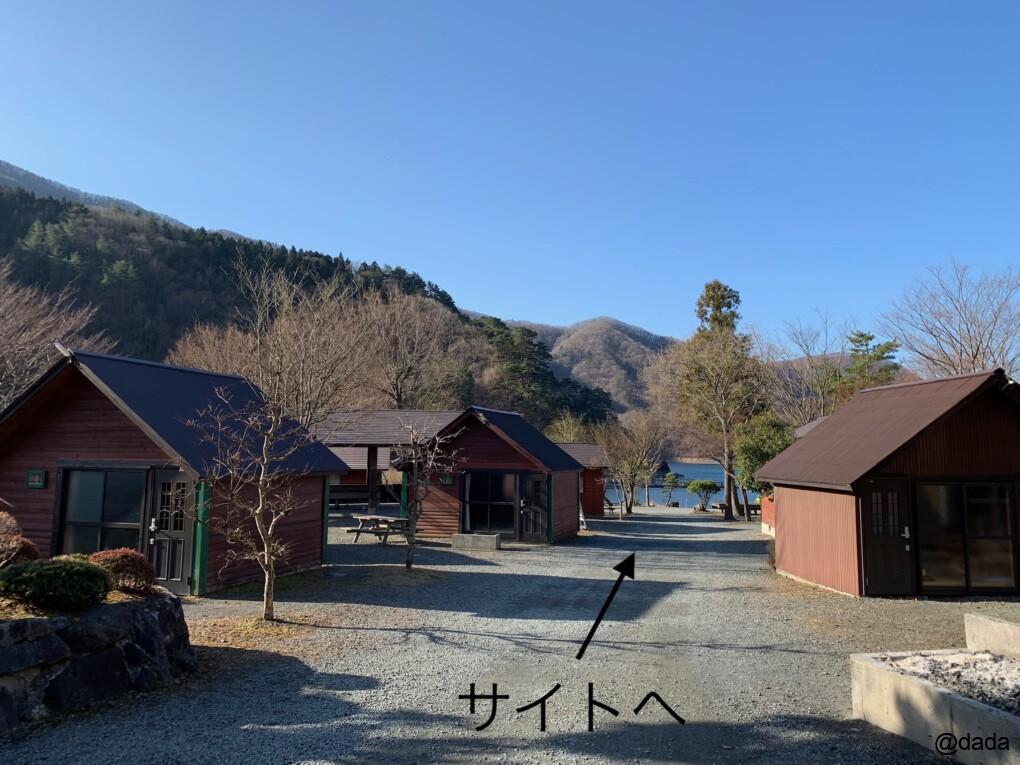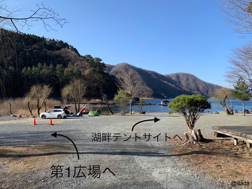 入口・管理棟に近い方からバンガローのエリア、その奥にキャンプサイトがあり、サイトは第1広場(テントサイト)と湖畔テントサイトに分かれます。