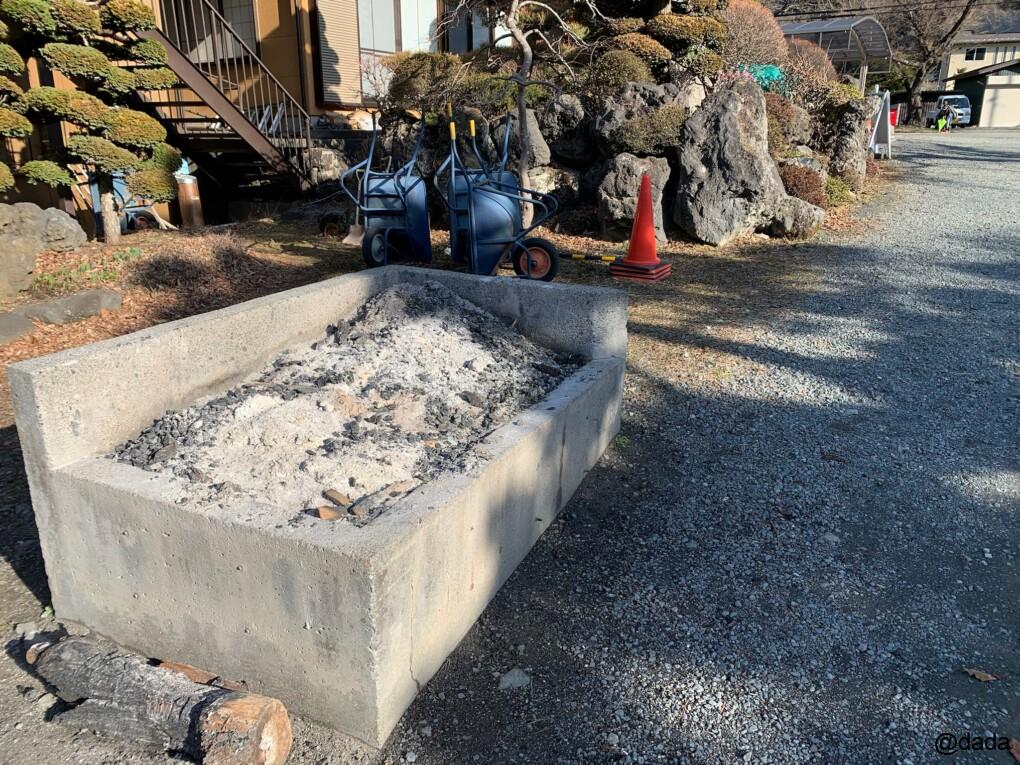 焚き火で出た灰については、ゴミ捨て場所の横にコンクリート造の捨て場があるのでそちらへ。