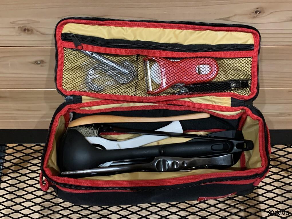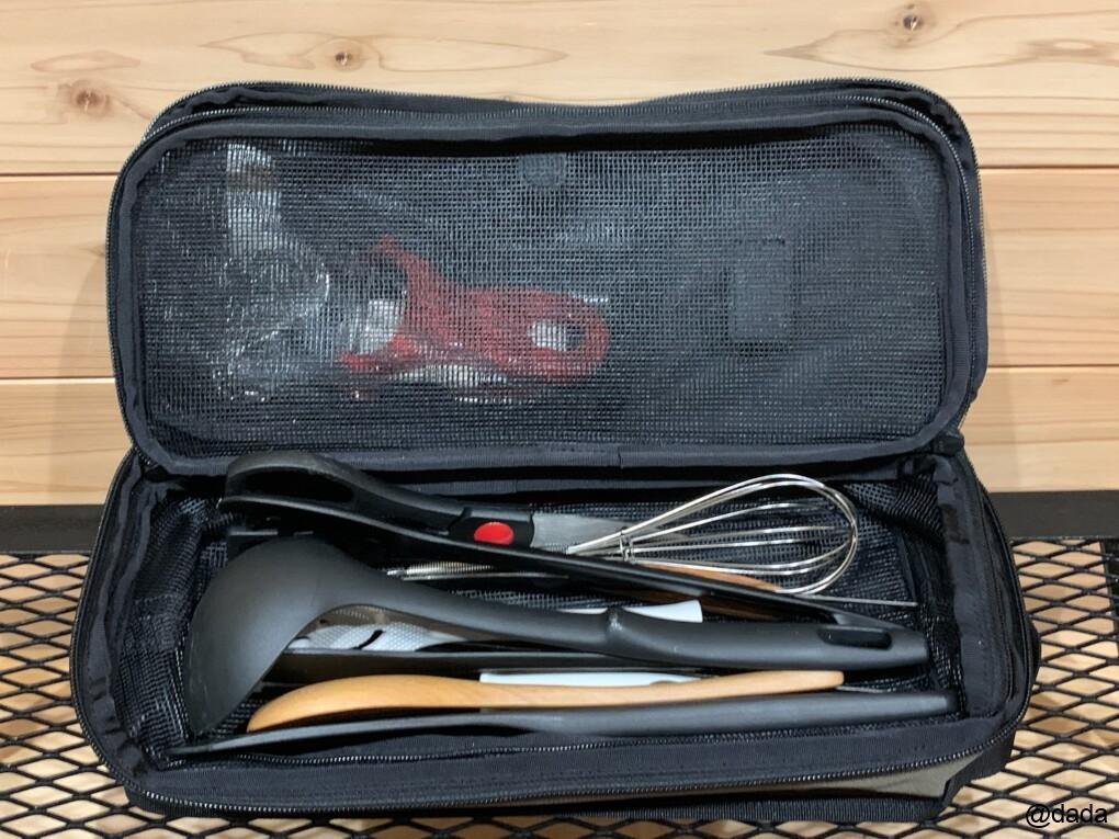 もともと付属されていたコールマンの調理器具は使わず、自分なりに使いやすいモノを厳選して収納していました。