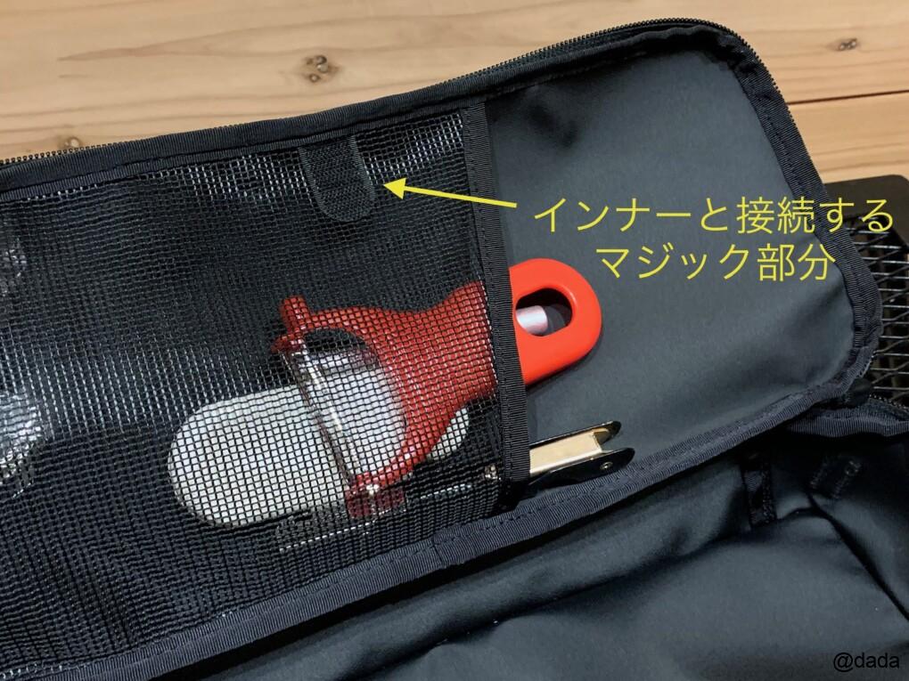 ちなみに、本体とインナーケースはマジックで接続しておくことができるため、常にインナーケースのファスナーを開けておき、本体のファスナーを開閉することで、面倒な手間がなく収納スペースにアクセスすることができます^_^