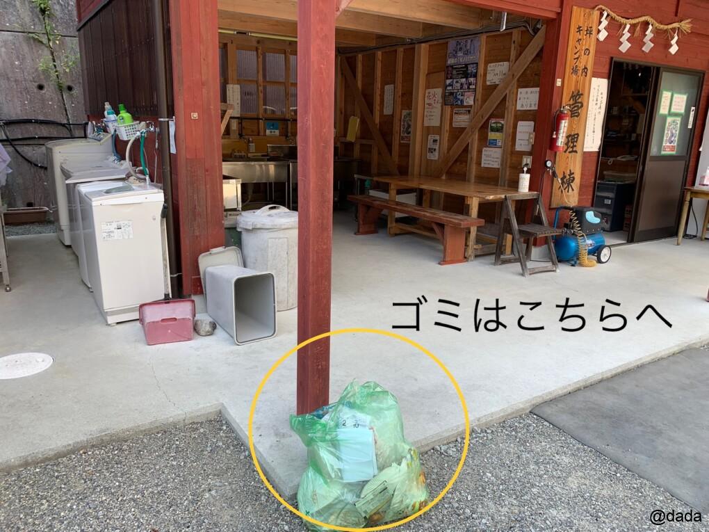 こちらのキャンプ場にはゴミ捨て場というものがないので、専用のゴミ袋に入れた後、炊事場の前に置いて帰るルールらしいです。