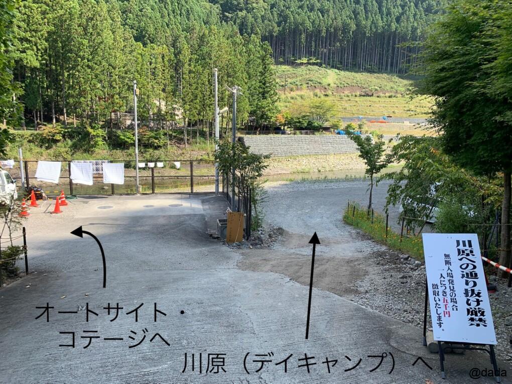 すると、すぐにオートサイトと川原への分岐がありますが、管理棟は左のオートサイト方面へ。