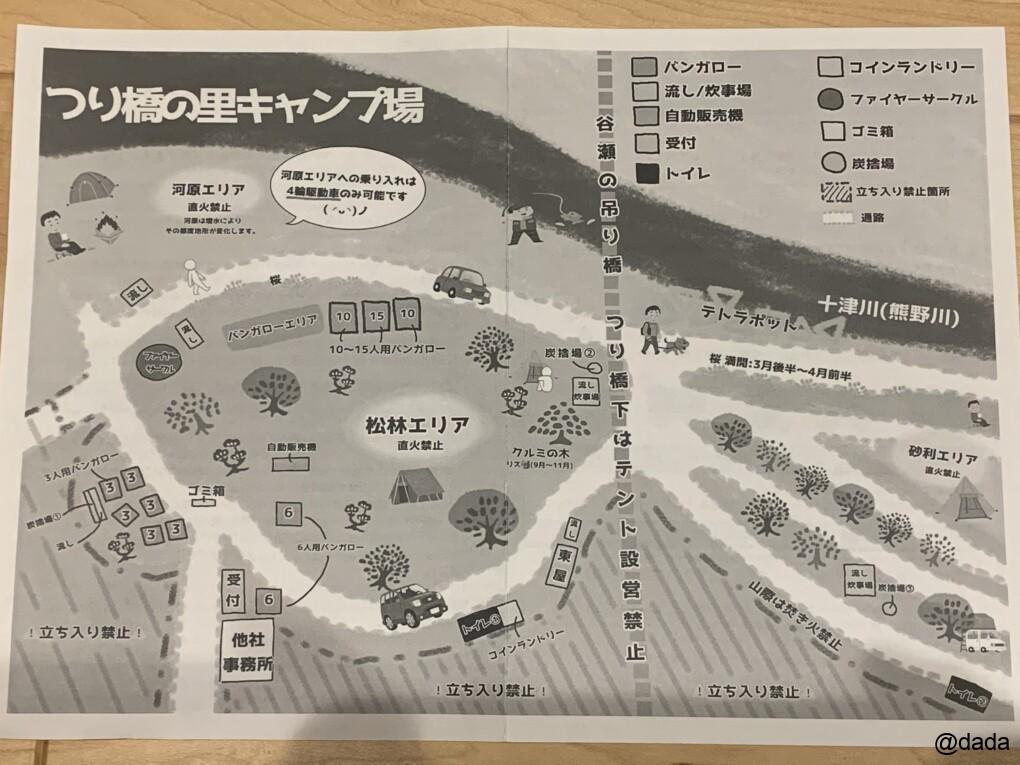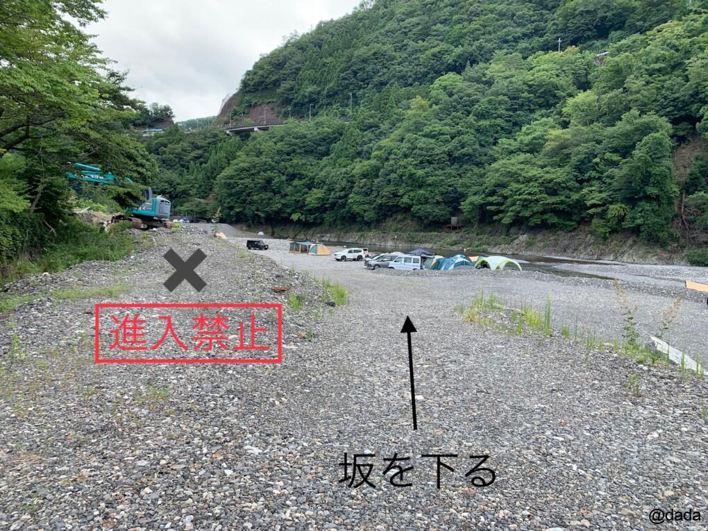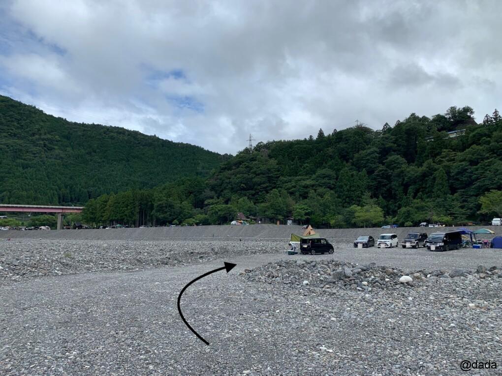 要はエリア内の通路を避けてテントを張るのですが、河原側の木の周辺、中央付近の木の周辺、あと山側の山の前辺りがテントスペースのようです。