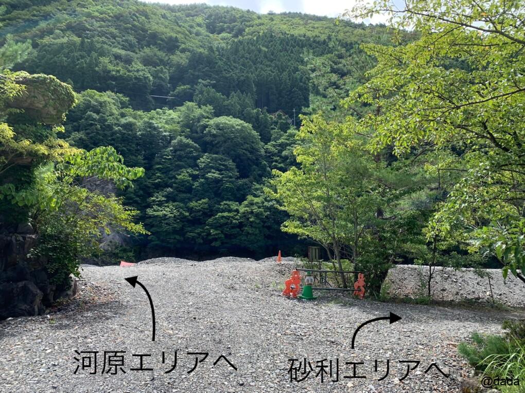 場内は車でぐるーっと一周できるイメージで、松林エリア、河原エリア、砂利エリアに分かれます。