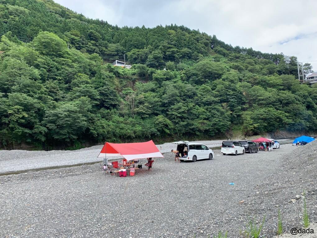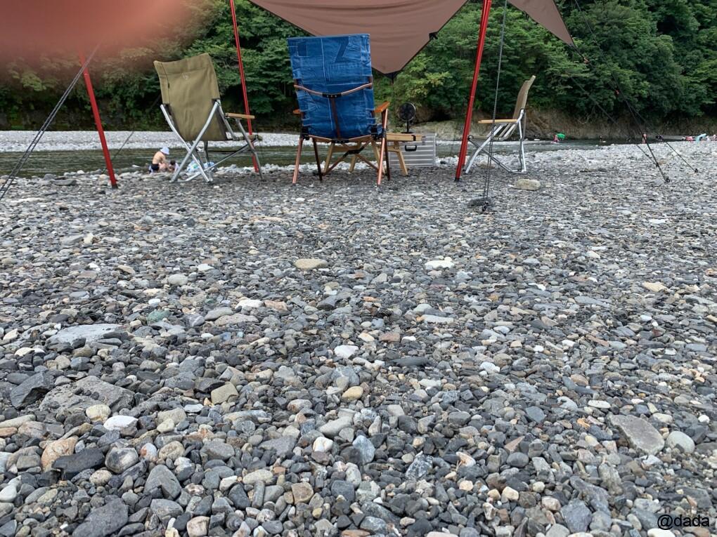 管理人さんから、「テントの設営は川に近づきすぎないようにお願いします」との説明がありましたが、川のすぐ側は大きめの石がゴロゴロしてるので、自然と設営スペースが決まってくる感じ。